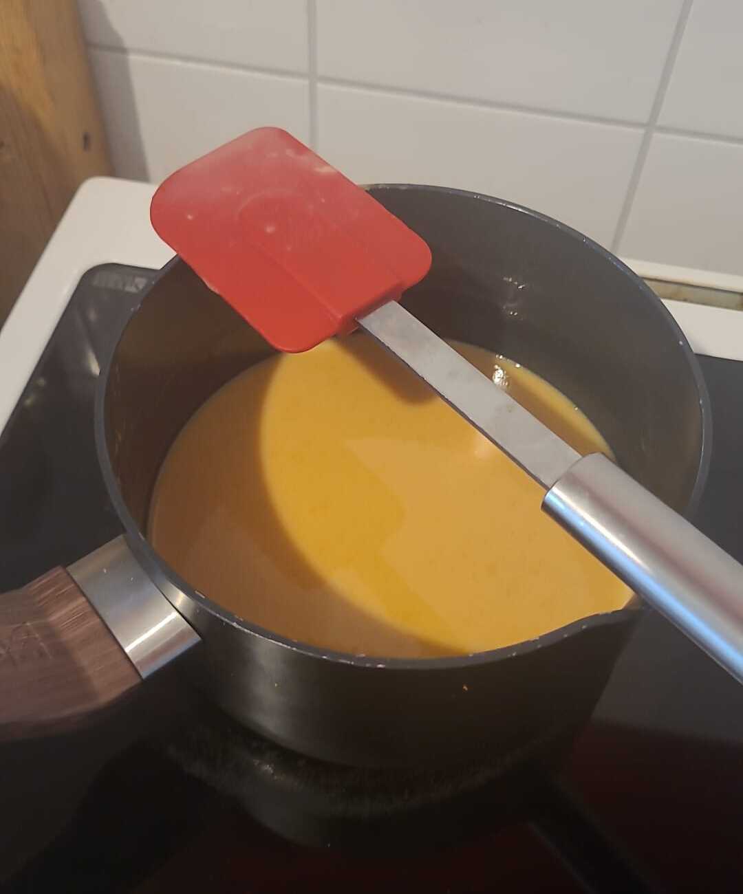2. Zodra er voldoende theesmaak is afgegeven, haal je de zakjes uit de room. Smelt je 100 gram witte chocolade in diezelfde pan en meng het allemaal samen. Je krijgt dan een mooi, gekleurd mengsel. Oranje boven!