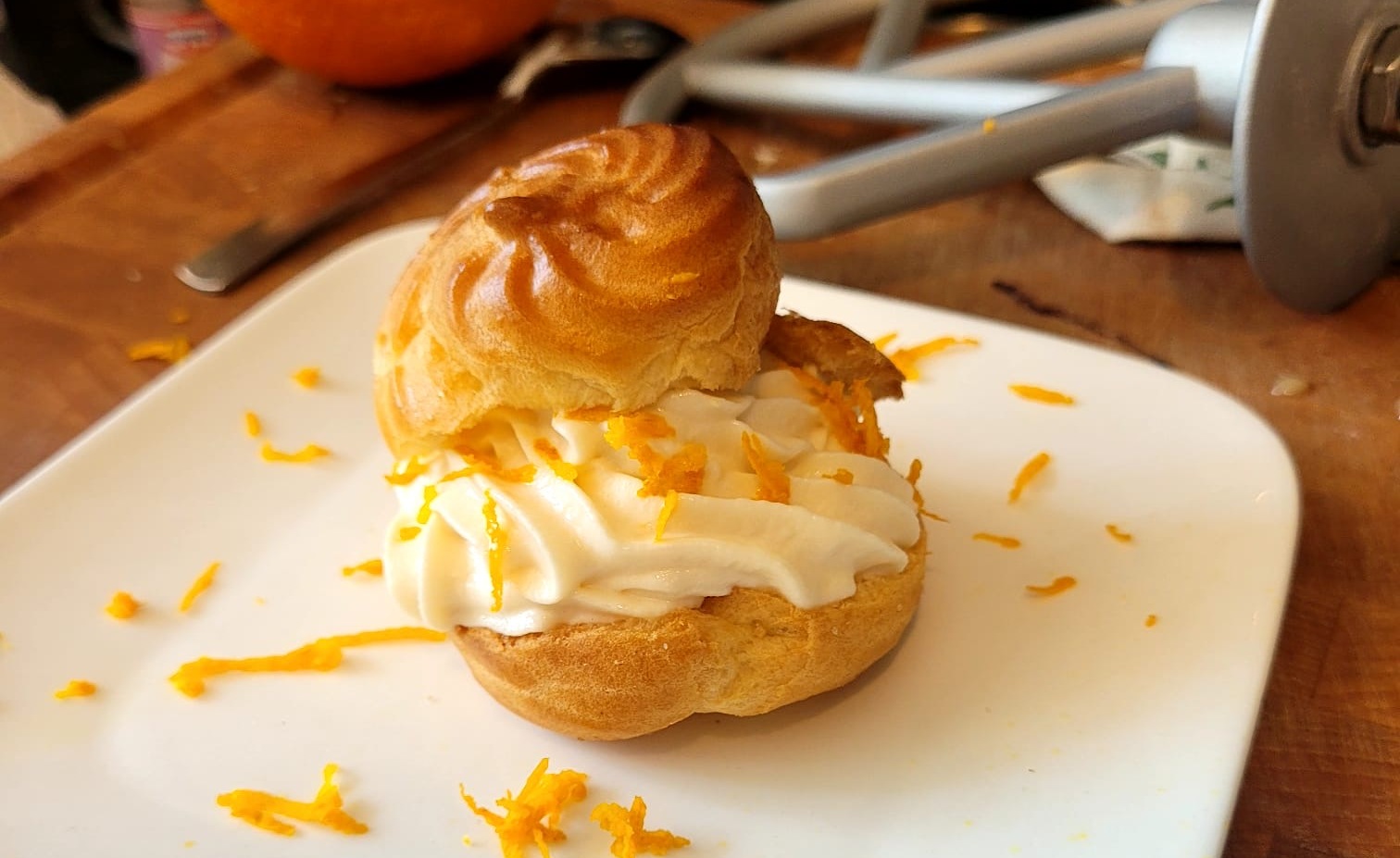 Klaar om de soezen af te werken? Stop de mousse in een spuitzak met een gemiddelde spuitmond en spuit op in de soes. Top ‘m af met het dakje en rasp eventueel wat extra sinaasappelschil ter decoratie. Eet smakelijk!
