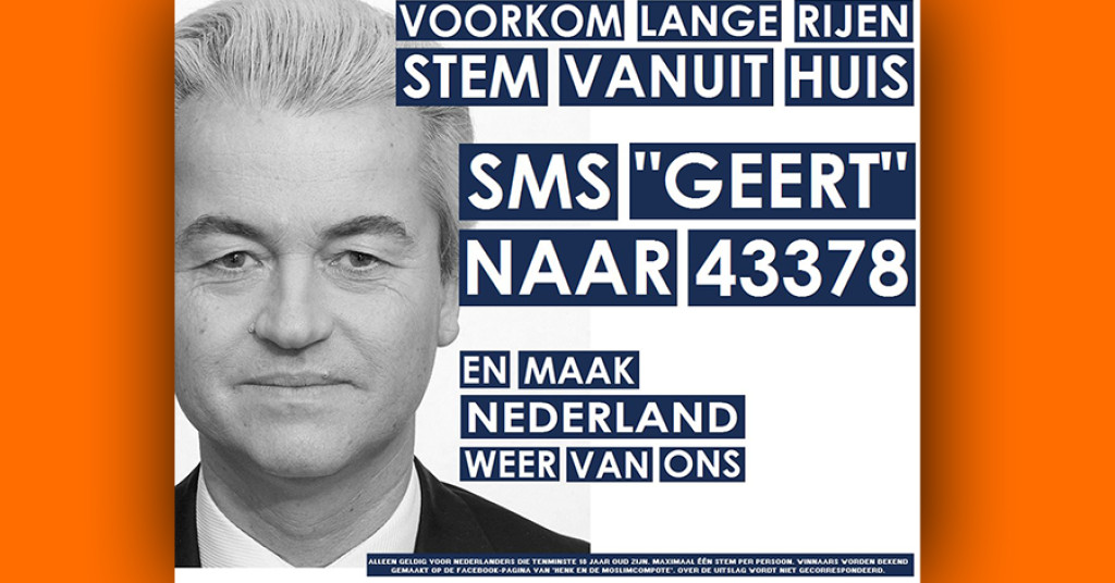 'Voorkom lange rijen, stem vanuit huis. Sms 'Geert' naar 43378 en maak Nederland weer van ons', valt er te lezen. De afbeelding is volledig in PVV-vormgeving gemaakt waardoor deze op het eerste oog moeilijk te onderscheiden is van andere uitingen van de partij.