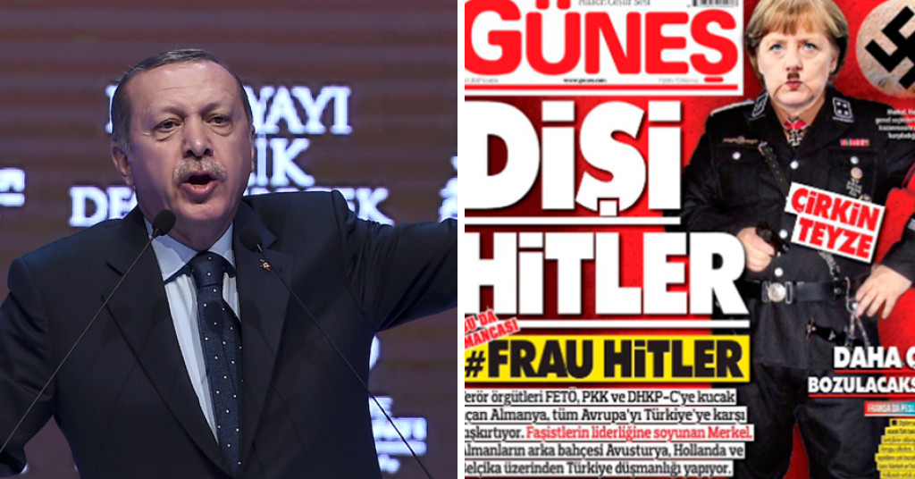 Recip Tayyip Erdogan verweet Angela Merkel gisteren het gebruik van "nazimethoden" in de omgang met Turken in Duitsland. Het was niet de eerste keer dat de Turkse president de oorlog van stal haalde. Eerder noemde hij Nederland ook al "een nazi-overblijfsel". Een Turks dagblad noemde Angela Merkel eerder 'Frau Hitler'.
