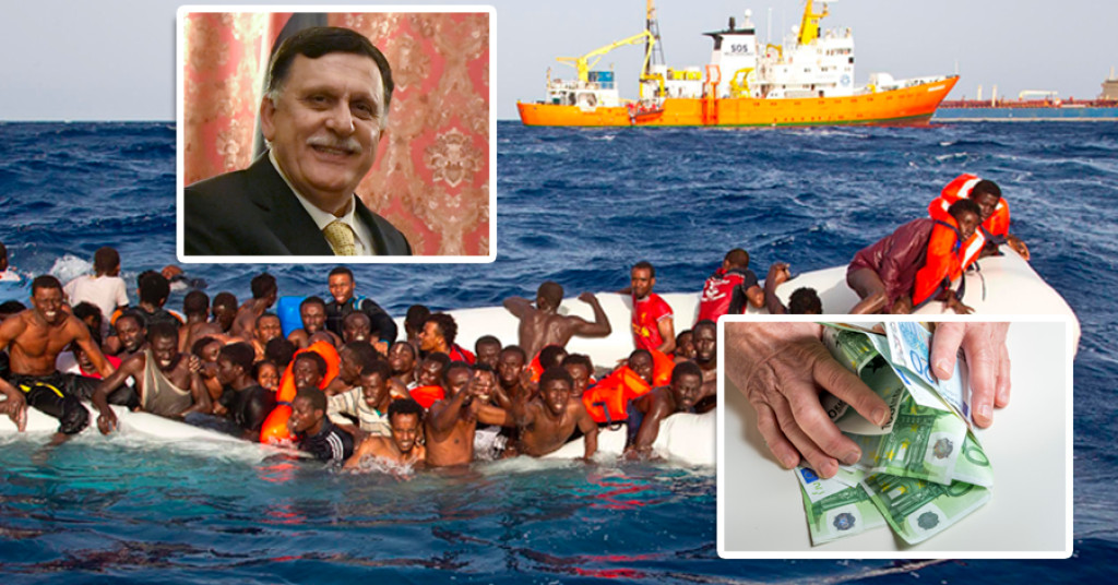 De Libische premier Fayez Seraj heeft maandag in Rome zijn eisen op tafel gelegd voor het afsluiten van de vluchtelingenstroom vanuit zijn land. Hij wil twintig patrouilleschepen, dertig terreinwagens, tien ambulances, vier helikopters, vierentwintig rubberboten, vijftien auto's, een reeks duikpakken, zuurstofcilinders en nachtkijkers, dertig satelliettelefoons en één radarinstallatie. Prijskaartje: 800 miljoen euro. Volgens de Volkskrant besloeg de eisenlijst van de Libische premier maar liefst tien A4'tjes.