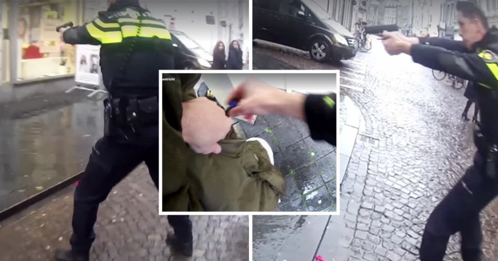 De politie ging naar de man op zoek nadat iemand 112 had gebeld en zag hem op de Oude Gracht in het centrum van Maastricht lopen. Omstanders kijken vreemd op als de agenten uit hun wagen springen en meteen naar hun wapens grijpen. De verdachte weigert bevelen op te volgen en wordt daarom met een voetveeg naar de grond gewerkt. Gelukkig verzet hij zich niet en kan hij zonder verder geweld worden aangehouden.