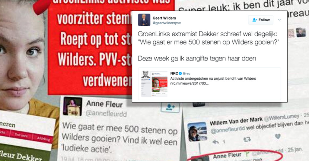 Wilders deelde eerder deze maand op Facebook een artikel over de activiste die in Hilversum werkzaam is als fractiemedewerker voor GroenLinks. Dit bericht was afkomstig van de pro-PVV-site Liefde voor Holland. Het betrof een collage van eerdere tweets van GroenLinks-aanhanger Dekker waarin onder andere te zien is dat ze "Wie gaat er mee 500 stenen op Wilders gooien? Vind ik wel een ‘ludieke actie’" twittert. Ook zegt Dekker dat ze voorzitter van een stembureau in Hilversum is en van plan is daar 'niet objectief' te werk te gaan.