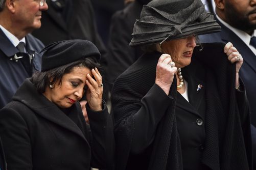 Tweede Kamer-voorzitter Khadija Arib (L) en Eerste Kamer-voorzitter Ankie Broekers-Knol bij het Nationale Monument op de Dam