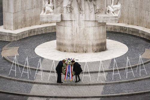 Koning Willem Alexander en koningin Maxima leggen een krans bij het Nationale Monument op de Dam.
