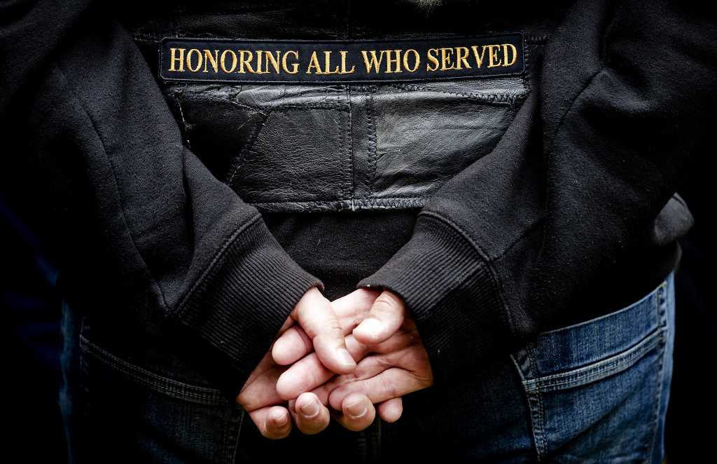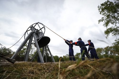 Leden van het Erepeloton Waalsdorp luiden de klok bij het monument op de Waalsdorpervlakte.