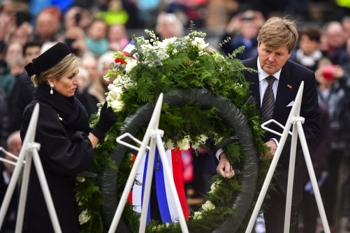 Koning Willem Alexander en koningin Maxima leggen een krans bij het Nationale Monument op de Dam