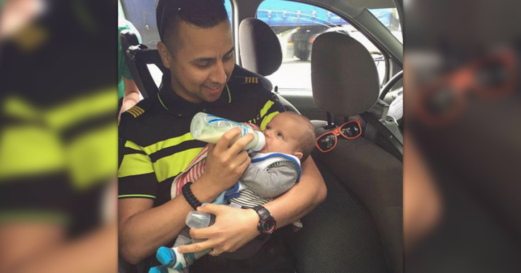 Een politieagent is vastgelegd toen hij gisteren na een ongeluk met een losgeslagen caravan een baby voedde. Het politieteam zette de foto zelf online op Facebook.
