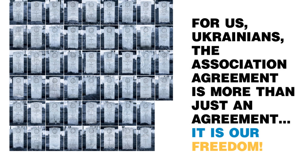 Met een gigantische advertentie met afbeeldingen van grafstenen in De Telegraaf roepen Oekraïners de Nederlanders op het associatieverdrag tussen de EU en het Oost-Europese land te steunen. Het verdrag werd eerder door het Nederlandse volk afgewezen in een referendum.