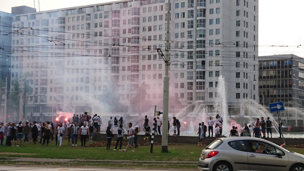 Supporters van de Turkse voetbalploeg Besiktas vierden gisteren feest bij de Hofplein fontein in Rotterdam, die roze kleurde vanwege de winst van Dumoulin.
