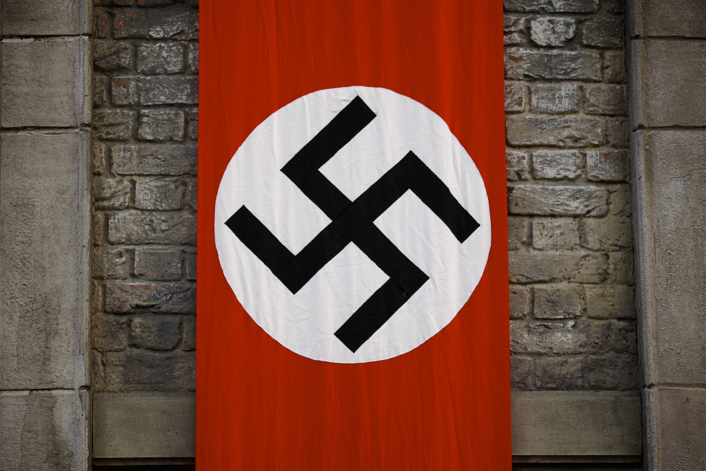 Doordat het hakenkruis met olie op het wegdek is getekend, is het lastiger om de tekening te verwijderen.
