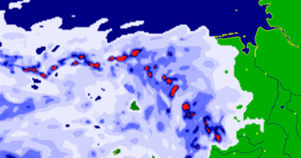 Het regengebied bereikt ons land vannacht vanuit het zuidwesten. Welke gebieden het zwaarst getroffen zullen worden is moeilijk te voorspellen. Zeeland, Brabant en de Betuwe zouden kandidaten zijn.