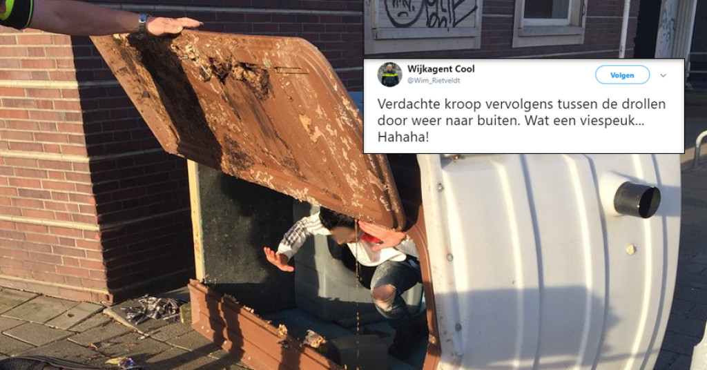 Agenten wilden de man aanhouden voor openbare dronkenschap. Op de foto is te zien hoe de man zich op onhandige wijze weer de Dixi uitmanoeuvreert. "Verdachte kroop vervolgens tussen de drollen door weer naar buiten. Wat een viespeuk... hahaha!" schreef de wijkagent die de man in de Dixi aantrof. Zijn collega was het daar van harte mee eens. "Slechtste verstopplek ooit", schreef hij.