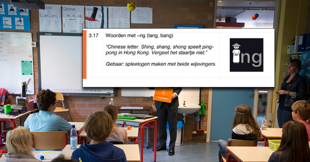 'Shing Shang Shong speelt ping-pong in Hong Kong.' Deze uitleg over de '-ng'-klank staat al meer dan vijf jaar in de lesmethode van pedagoog José Schraven. Vooral de suggestie voor de leraar die erbij staat, heeft tot verontwaardiging geleid bij ouders.
