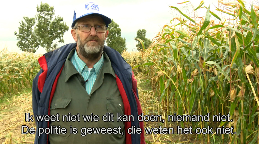 Boer Jan van Zuilichem is er kapot van. Op zijn land staken vandalen spijkers in het mais en bonden zijn stalen buizen aan de planten. Hierdoor is het mais onbruikbaar en zijn de machines beschadigd. “Ik ben boos en ik ben helemaal verslagen, want ik kan hier niks aan doen”, aldus Jan.
