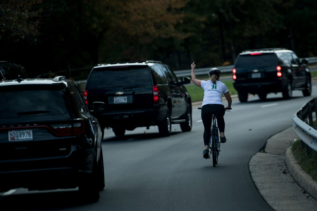 Julia Briskman was een rondje aan het fietsen toen ineens de presidentiële stoet van Donald Trump langs kwam fietsen. Ze stak haar middelvinger op naar de president en dat werd vastgelegd door een fotograaf. Toen haar baas de foto zag werd ze echter ontslagen.