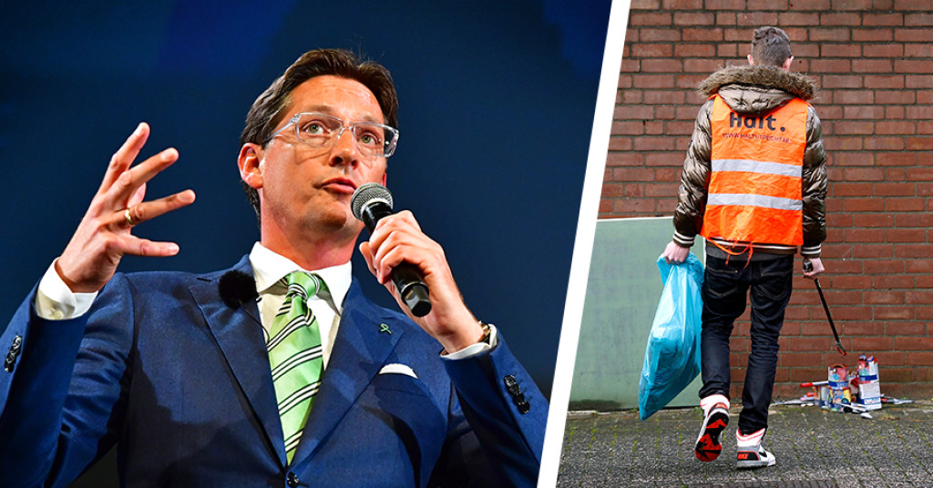 Volgens de wethouder moeten criminelen met een taakstraf hun werk doen in een hesje met de tekst 'Ik doe boete'. Ook wil hij homo-belagers in "een roze overal laten schoffelen".