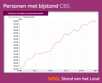 De groei van de bijstand wordt op jaarbasis bekeken. Tussen september 2016 en september 2017 is het aantal bijstandsgerechtigden tot de AOW-leeftijd met 6000 gestegen naar 465.000, schrijft persbureau ANP.