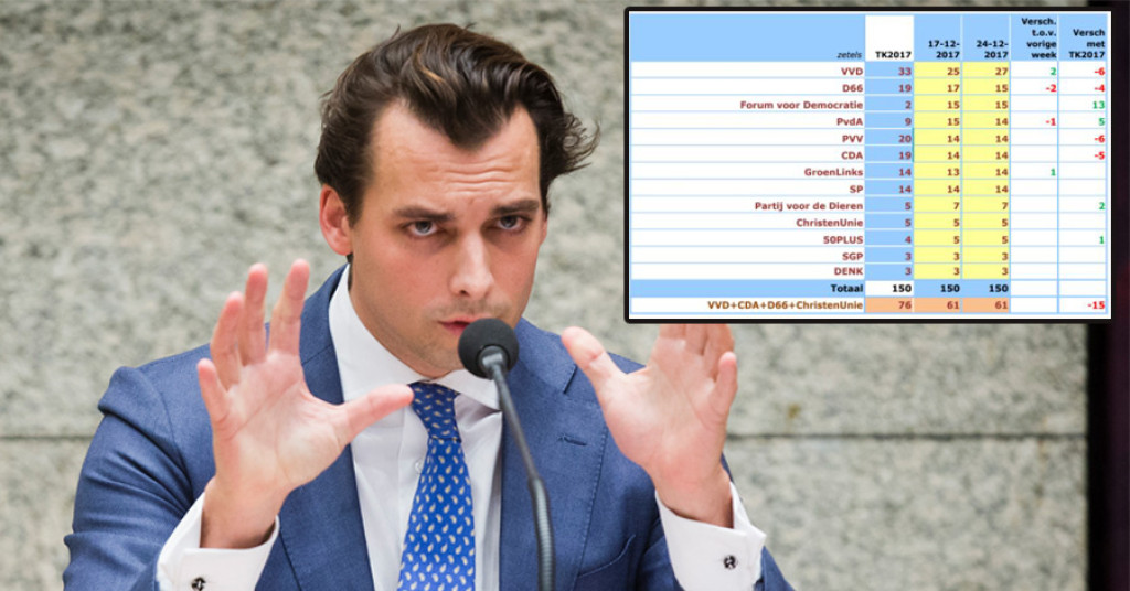 Als er nu verkiezingen zouden zijn, zou Forum voor Democratie uitkomen op liefst 15 zetels. Daarmee zou de partij van Thierry Baudet, samen met D66, de tweede partij van Nederland zijn. De VVD kan met 27 zetels op de meeste zetels rekenen.