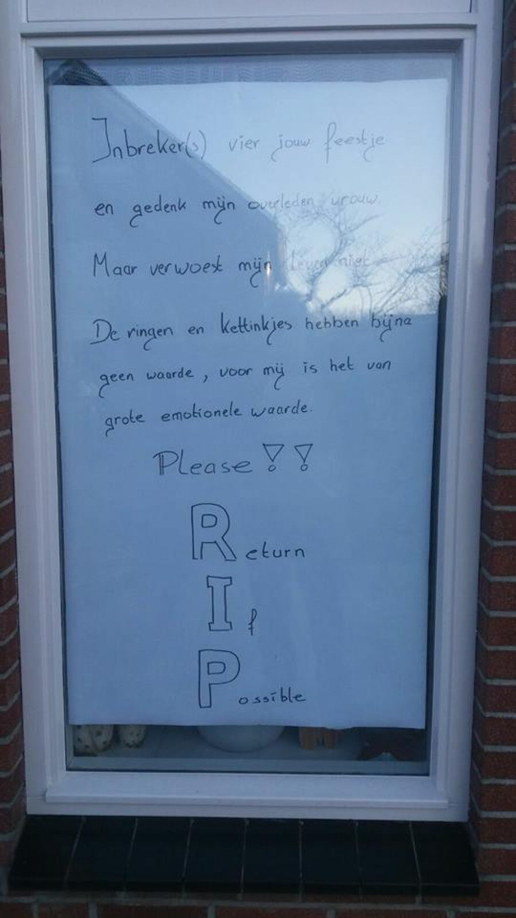 "Inbrekers vier jouw feestje. En gedenk mijn overleden vrouw. Maar verwoest mijn leven niet. De ringen en kettinkjes hebben bijna geen waarde, voor mij is het van grote emotionele waarde. Return If Possible".