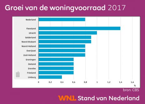 Met name in de provincie Flevoland is de groei van de woningvoorraad toegenomen. Ook de provincies Utrecht, Gelderland, Noord-Brabant en Noord-Holland scoren hoger dan het landelijk gemiddelde.