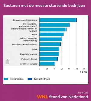 In de onderwijssector en de detailhandel neemt het aantal starters het meest toe. De grootste goed onder startende bedrijven is managementsadviesbureau, maar deze bedrijven stoppen ook het vaakst.