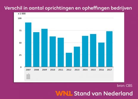 In 2017 zijn in Nederland ruim 73.000 nieuwe bedrijven gestart. Dat is het grootste aantal sinds 2009, blijkt uit cijfers van het CBS.