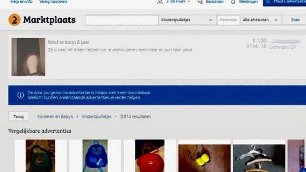 'Kind te koop, 8 jaar' luidde de kop boven de advertentie. Daarnaast is een foto te zien. 'Ze is heel lief alleen hebben we te veel kinderen neem haar en gun haar geluk.' De advertentie werd een uur later alweer verwijderd, maar was toen al door velen opgemerkt.