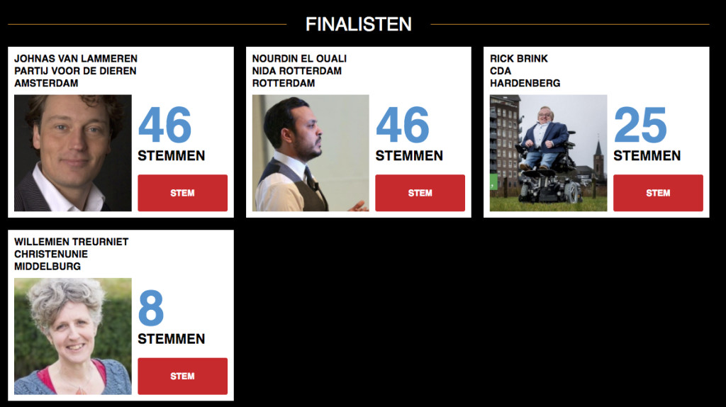 De verkiezing van Het Beste Raadslid van Nederland nadert een ontknoping: in de aanloop naar de finale kan nu nog gestemd worden op één van de vier kandidaat-raadsleden: Nourdin El Ouali (Nida, Rotterdam), Rick Brink (CDA, Hardenberg), Johnas van Lammeren (Partij voor de Dieren, Amsterdam), of Willemien Treurniet (Christenunie, Middelburg).