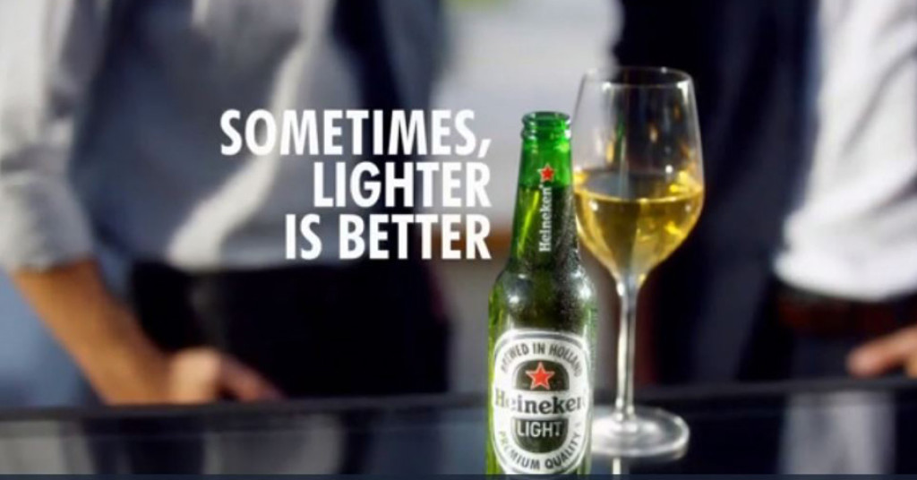 In de reclame is een barman te zien die Heineken light-bier naar een blanke vrouw schuift, na een paar donkere personen te hebben gepasseerd. De slogan 'Sometimes, lighter is better' komt daarna in beeld.