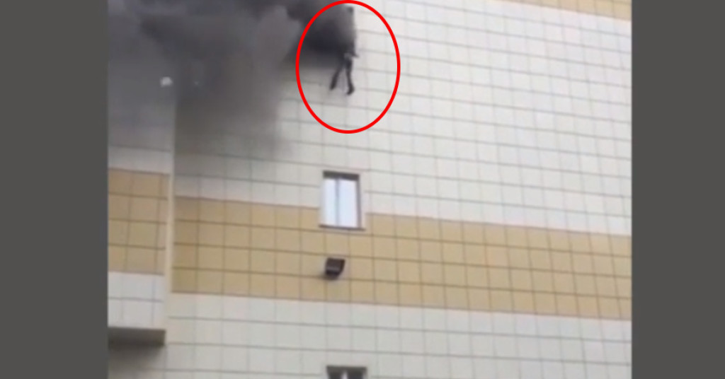 Een Russische filmer heeft vastgelegd hoe een 11-jarige jongen zijn eigen leven wist te redden door uit een raam van de vierde verdieping te springen. De jongen ontsnapte daarmee aan de de vuurzee die afgelopen weekend aan 64 mensen het leven kostte in de Russische stad Kemerovo.