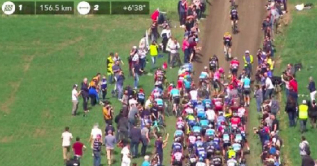127 km - Slecht nieuws over Michael Goolaerts. Hij is hard gevallen op de tweede kasseistrook. Volgens ploegleider Michiel Elijzen heeft hij een hartstilstand gehad en is hij gereanimeerd, maar ook een paar keer weggezakt. Bij de ploeg is de huidige situatie niet bekend.