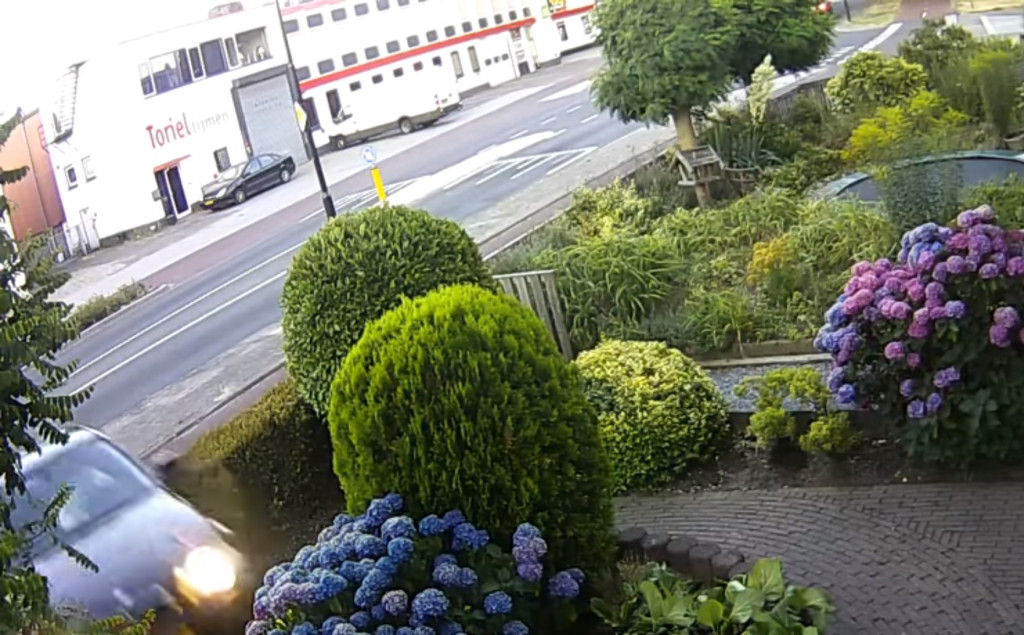 Het voorval is vastgelegd op een beveiligingscamera. Daarop is te zien hoe de man in een zwarte BMW de hoek om komt gereden en met flinke snelheid via de voortuin op een huis knalt.