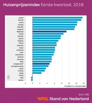 Gemiddeld is de ontwikkeling van de huizenprijsindex in de Europese Unie 4,7 procent. De meeste landen in de EU zitten daarboven. Nederland staat op de zevende plek. In Letland (13,7 procent) en Slovenië (13,4 procent) zijn de huizenprijzen het meest gestegen.