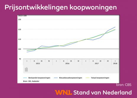 De prijzen van koopwoningen in Nederland waren in het eerste kwartaal van 2018 9,3 procent duurder dan in 2017. Daarmee is de prijsstijging in ons land twee keer zo hoog als het Europees gemiddelde.