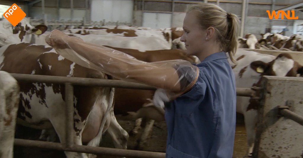 Van Noord laat zien hoe de koe wordt geïnsemineerd door een van zijn medewerkers. "Op het moment dat de koe tochtig is, wordt ze geïnsemineerd met het sperma dat we in het lab in rietjes hebben gedaan." De inseminatrice Patricia brengt het sperma vervolgens in bij de koe. "We kunnen over zes weken kijken of het gelukt is," zegt Van Noord. "Patricia kennende zal het wel zo zijn want bij haar is het vaak in één keer raak. Dat zullen we zien op de echo."