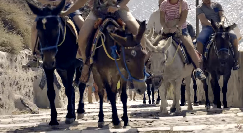 Het rijden op een ezel is een populaire attractie op het toeristische eiland Santorini, in de Egeïsche Zee. De ezels worden gebruikt om toeristen de steile trappen van het bergachtige eiland op te helpen.