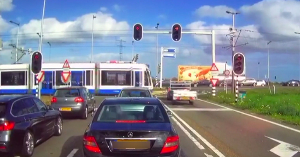 In Amsterdam is vandaag een automobilist op tram 26 gebotst, waarna de tram ontspoorde. Op dashcambeelden bij AT5 is te zien dat de auto door rood rijdt, en daarna hard op de tram botst.