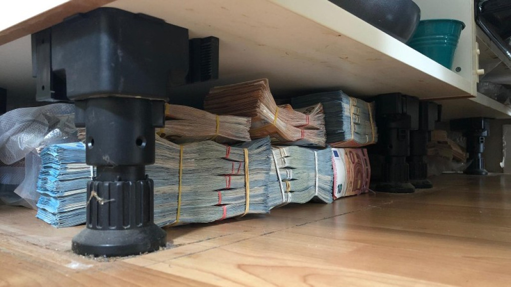 Bij een eerste huiszoeking aan het Zuiderterras troffen agenten eerst geld aan in een televisiemeubel. Daarna werd een groot deel van het geld onder het keukenblok. Het geld was verstopt achter een plint. In de keuken werden ook meerdere stoffen gevonden die worden gebruikt bij het verpakken van drugs.