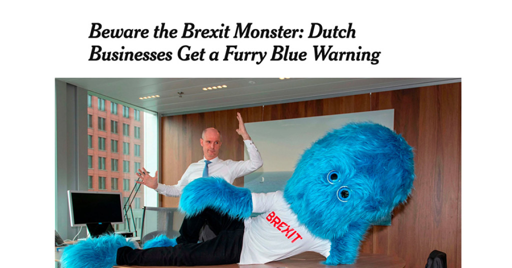 De campagne met minister Stef Blok om Nederlandse ondernemers te waarschuwen voor brexit gaat de hele wereld over. De foto waarop Blok poseert met een pluizig, blauw Brexitmonster leidde overal tot hilariteit en gefronste wenkbrauwen.