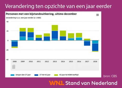 Het aantal mensen dat in Nederland een bijstandsuitkering ontvangt is het afgelopen jaar met 24.000 duizend afgenomen. Dat meldt het Centraal Bureau voor de Statistiek op basis van nieuwe cijfers. "Eind 2018 telde Nederland 433 duizend bijstandsgerechtigden tot de AOW-leeftijd", aldus het CBS.