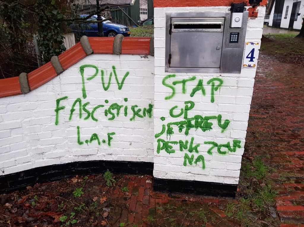 Een muur bij de woning van de Friese PVV-kandidaat Jeffrey Graansma is beklad met leuzen. Dat meldt ANP.