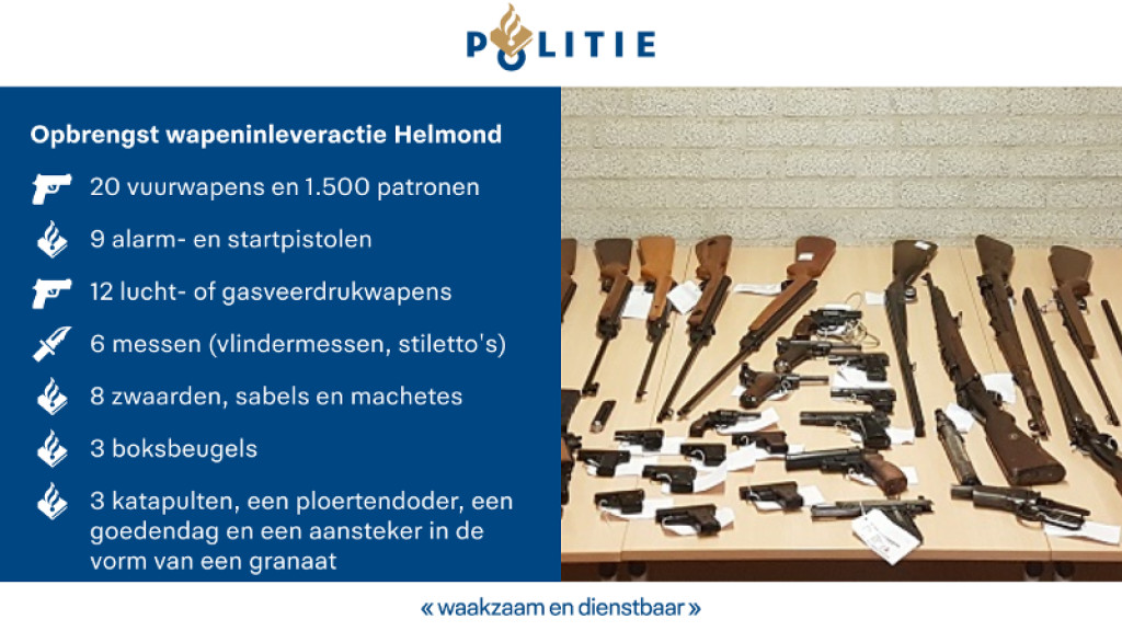 Een inleveractie van de politie Helmond is succesvol verlopen. In totaal werden er meer dan 70 wapens ingeleverd tijdens de speciale actie, waarbij mensen de wapens in konden leveren zonder verdere gevolgen. Ook werden er 1500 kogels ingeleverd.