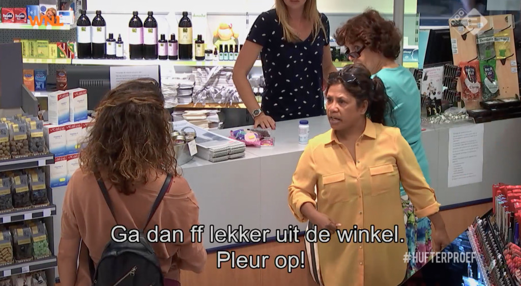 In Hufterproef zien we morgenavond hoe een vrouw een asociale klant op haar plek zet door het op te nemen voor de winkelier. "Ga dan even lekker de winkel uit. Pleur op!", zegt de vrouw.