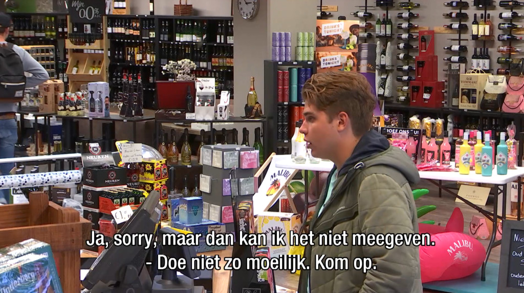 "Ik mag het niet aan je verkopen, ik weet niet hoe oud je bent", zegt de verkoopster. "Je ziet toch dat ik 18 ben?", reageert de jongen geërgerd. Zijn identiteitsbewijs zou nog thuis liggen. "Ik heb een feestje vanmiddag en ik kom hier niet uit de buurt."