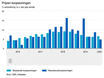 Gekeken over alle koopwoningen, dus inclusief bestaande huizen, was er volgens het CBS sprake van een prijsstijging van 6,3 procent vergeleken met dezelfde periode vorig jaar. Dat is een hardere stijging dan in Europa, waar koopwoningen gemiddeld 5,5 procent in prijs toenamen.