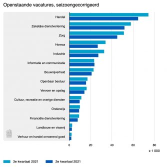Eind september stonden er 371.000 vacatures open. Dat is een recordhoeveelheid en 45.000 meer dan eind juni. In de handel, zakelijke dienstverlening en de zorg werd het meest naar personeel gezocht. Deze sectoren zijn samen goed voor de helft van alle openstaande vacatures. Maar de toename van het aantal vacante posities is te zien in bijna alle sectoren. Alleen in de informatie- en communicatiebranche is er geen toename te zien.