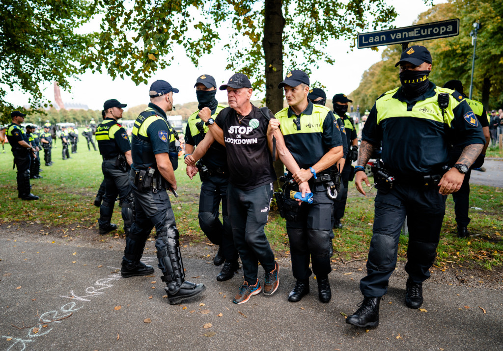 Tijdens de afgelopen persconferenties, die worden gehouden in het ministerie van Justitie en Veiligheid op de Turfmarkt in Den Haag, is het vaak rumoerig. Tegenstanders van het beleid maken op luide wijze hun ongenoegen kenbaar en de politie heeft al geregeld flink moeten ingrijpen. "We gaan niet de stad laten slopen. Bij calamiteiten grijpen we gelijk in."