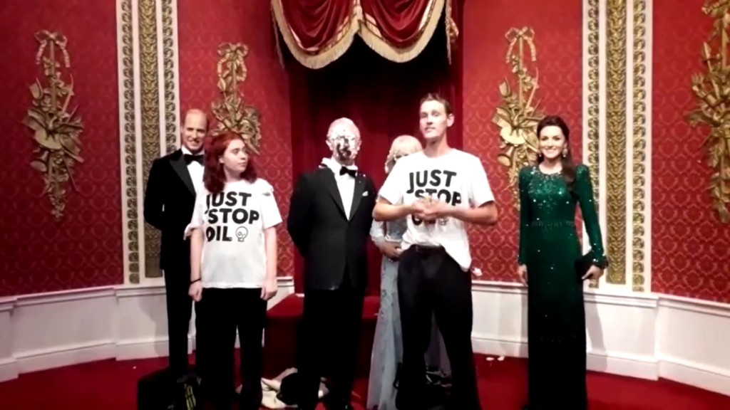 De activisten willen dat de Britse regering alle nieuwe olie- en gasvergunningen stopzet. De politie heeft vier mensen gearresteerd. Madame Tussauds heeft besloten dat de wassen beelden van de Britse koninklijke familie voorlopig niet te zien zullen zijn.