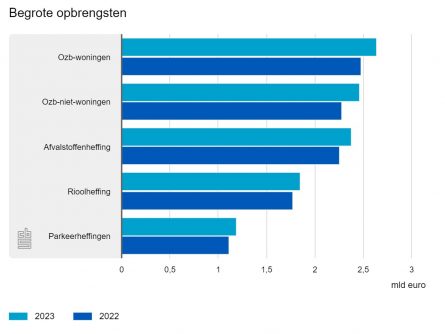 De ozb, de afvalstoffenheffing, de rioolheffing en de parkeergelden zijn de vier heffingen die het meest opbrengen. Ze zijn in 2023 goed voor 86 procent van de begrote heffingsopbrengsten. Van die vier zorgt vooral de ozb voor vollere gemeenteschatkisten. Eigenaars van een huis, bedrijfspand of andere onroerende zaak moeten deze belasting jaarlijks betalen aan de gemeente. Voor 2023 hebben de Nederlandse gemeenten 5,1 miljard euro aan ozb-opbrengsten begroot. Dat is bijna 7,5 procent meer dan een jaar eerder. Deze stijging komt volgens het CBS vooral door de gestegen WOZ-waarden, die vertraagd meebewegen met de huizenprijzen.